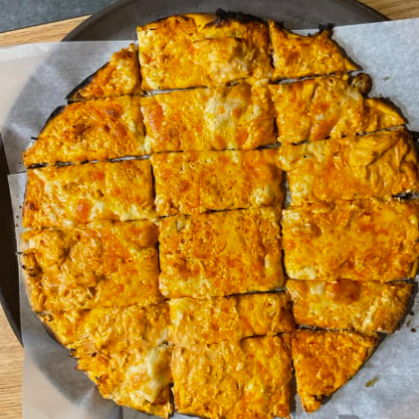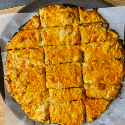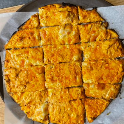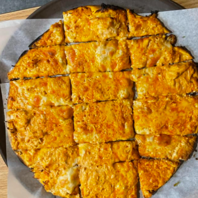 Creamy Buffalo Chicken, topped with Onions, Peppers and cheese.