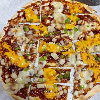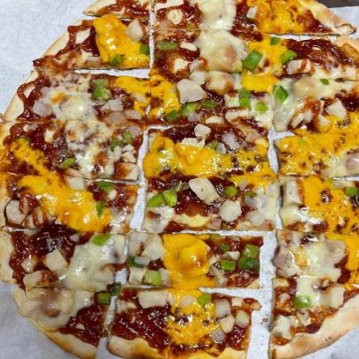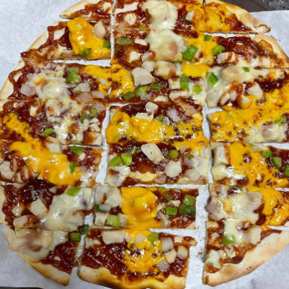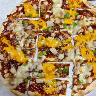 BBQ Sauce, Topped with Chicken, Onions, Peppers and cheese.