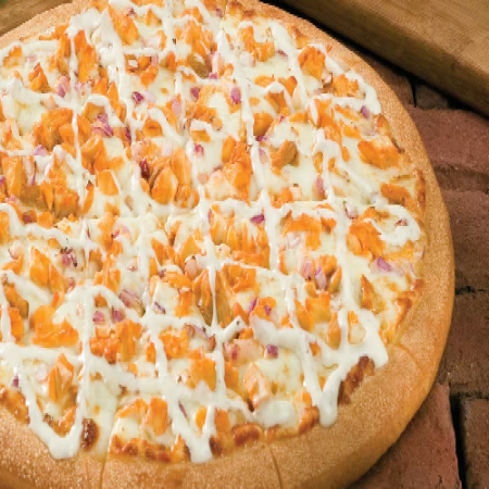 Spicy Buffalo Sauce, boneless grilled Buffalo Chicken Breast Strips, Red Onions, Mozzarella Cheese. Topped with a creamy Ranch drizzle.