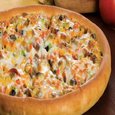 Piled high with premium Pepperoni, slow-roasted Ham, seasoned Beef, savory Sausage, Italian Sausage, naturally wood smoked Bacon Bits and Mozzarella Cheese.