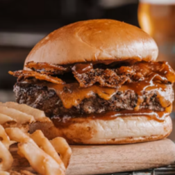 Marinated BBQ Chicken topped with red peppers and red onions. Garnished with cilantro.